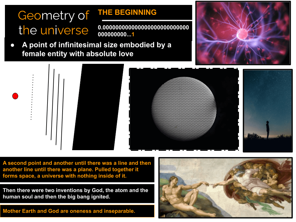 Inside was the Mother Earth with infinite love but stuck inside of this infinitesimal point. First, she spent eternity in that point imagining the universe that she would create going from nothingness to something to everything. It would take infinity to create a universe of infinite life that the Mother Earth could love like her children.